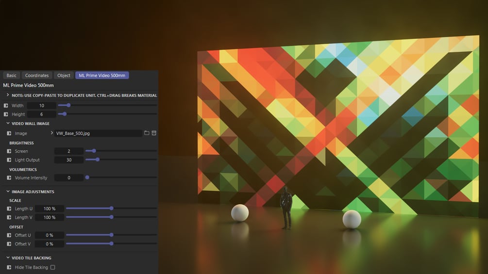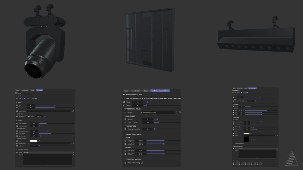 Prime comes with a Moving Head unit, a Bar/Strip unit, and two Video Wall units (1M tile or 500mm tile). All units have gobos, targeting capabilities, color randomization and built in cloning.